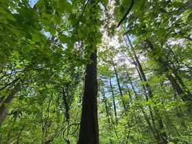 木々と太陽、綺麗な青空がお見事です。木漏れがとても気持ち良さそうです。
