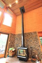 太く長く伸びた薪ストーブの煙突。薪ストーブ特有の遠赤外線の熱が心地よく身体を温めてくれます。