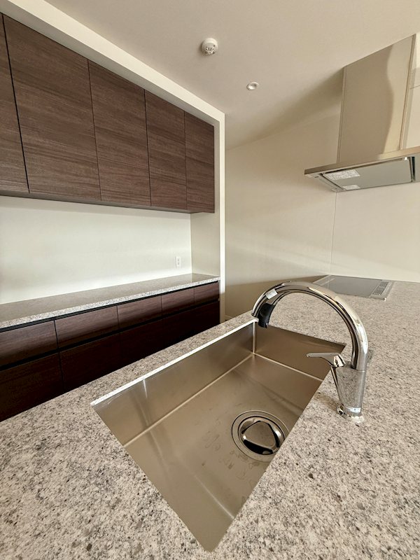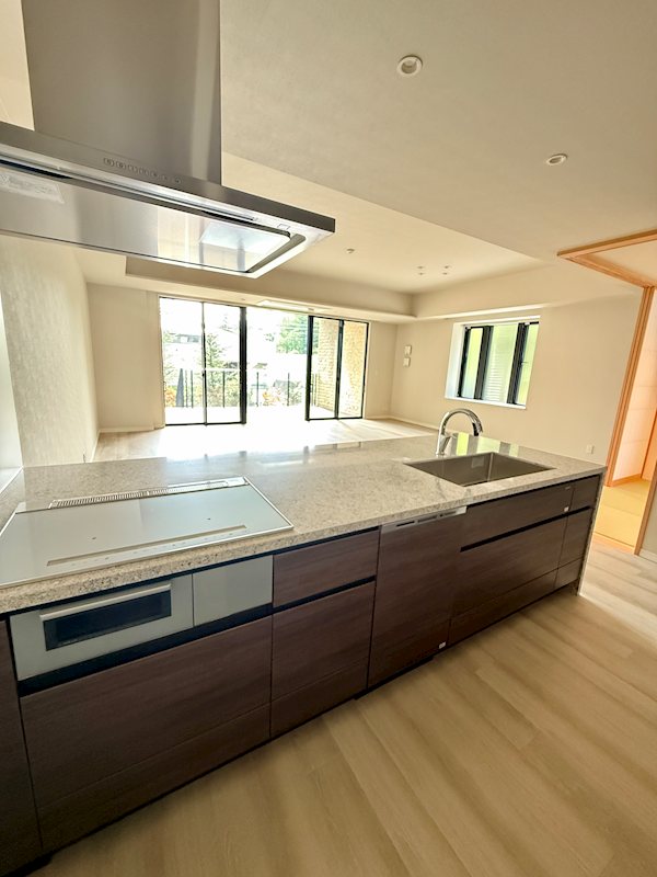 機能性とインテリア性を重視した高級感あるキッチン。食洗機付き、コンロはIHクッキングヒーターです。