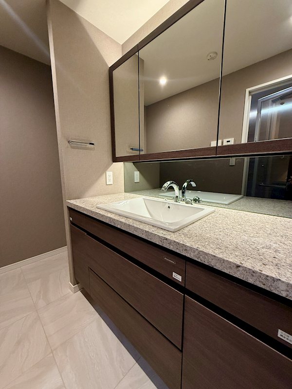 パウダールームには大型三面鏡で収納力もあります。カウンターも広くて使いやすいです
