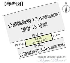 | 主な接道 | 公道、南、幅員:5.5m、接道長さ:16.2m、舗装あり 公道、北、幅員:17m、接道長さ:15.8m、舗装あり | ||