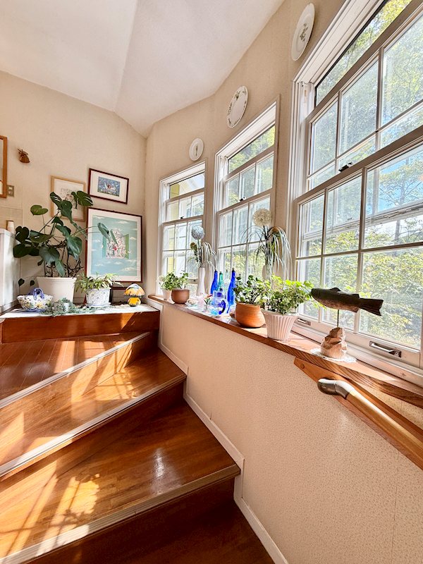 2階へと続く幅の広いゆったりとした階段。日当たりの良い踊り場の雰囲気が素敵です。