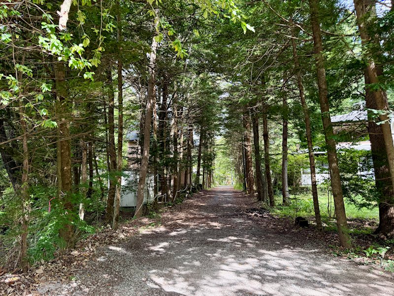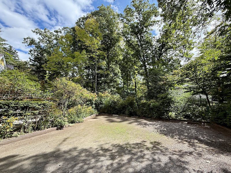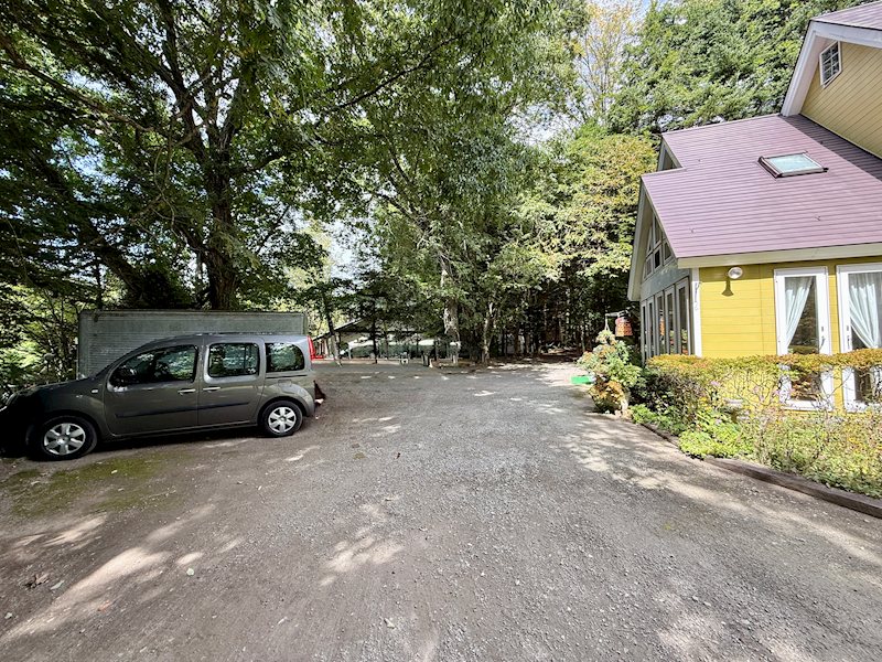 駐車スペースから南側にかけて。敷地内の樹木でムササビウォッチングができることも。訪れるゲストを喜ばせてくれます。