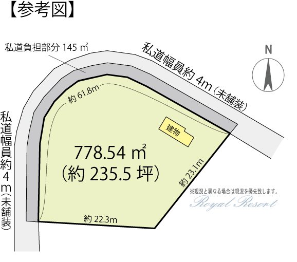 | 主な接道 | 私道、北、幅員:4m、接道長さ:61.8m | ||