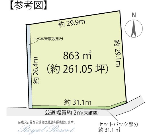 地目:原野・雑種地 ■参考固都税額(令和7年度)60,054円/年 ■本件敷地西側の一部(34㎡)に、水道管本管が埋設されています。当該本管は口径が小さいため、引き込みには布設替えを要します。(約50m)また、布設替えの際、土地所有者の承諾を要する場合があります。 ■前面道路2項道路につき、測量の結果後退や造作物等の撤去を求められる可能性があります。また、記載のセットバック面積は参考面積の為、実際の面積と異なる場合があります。 ■軽井沢町の要綱により、建築物の延面積の上限は200㎡に制限されます。 |