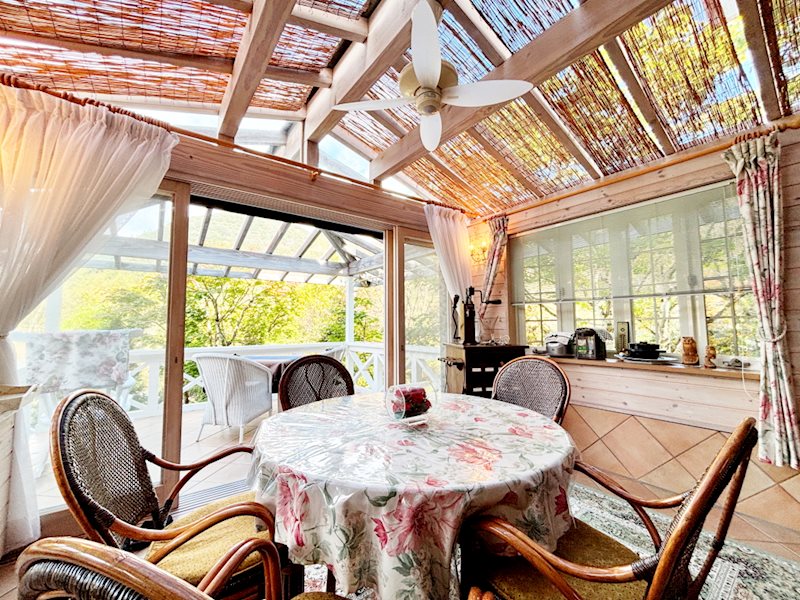 南軽井沢エリア、丸紅別荘地から、程度の良い山荘風戸建のご紹介です。高台立地のため風通しが良く、アプローチも少々登りにはなりますがほとんど苦になりません。自慢はなんといってもコンサバトリーとテラスからの眺め。周辺の借景を見下ろすロケーションは、まさに緑に浮かぶカフェテラスのようです。特に大きなお直しをすることなくこのままお使いになれる状態です。おすすめの物件ですのでぜひ御見学下さい。