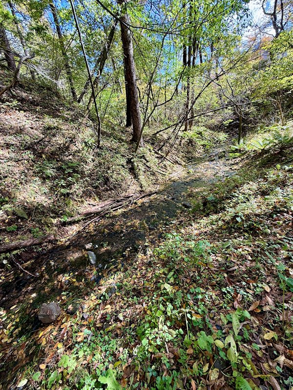 国有林との境には川が流れています。野鳥のさえずりに包まれます。