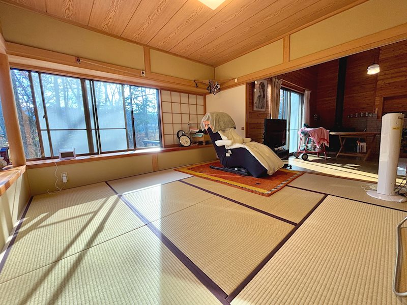 北軽井沢の交差点から約1.4㎞南の場所、舗装道路から1本入った所に北側の景色が気持ちが良いぐらい抜けた戸建のご紹介です。リビングには別荘らしく薪ストーブを完備、天井も吹抜けになっており開放感がございます。板張り仕上げの室内は温かみがあり、南側の開口部は大きく、存分に明かりを取り込むことが出来ます。敷地も約436坪と広いのでガーデニングや家庭菜園、ドッグランと何でも楽しめます。管理別荘地ではないので管理費は掛かりません。自然の中で田舎暮らしをされたい方、是非ご内見ください。