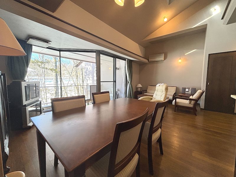 購入してからこれまで25年位所有して参りましたが、利用頻度が少ない為、この度思い切って売却する事に致しました。天井がとても高いので窮屈さをまったく感じませんし、天窓から入る採光が室内を明るく保てます。リビングダイニング、そしてキッチンもゆったりと使える広さです。窓から見える爽やかな緑に心癒され、軽井沢ライフを楽しんできました。この先引き継いで楽しんで頂ける方とのご縁を期待しております。よろしくお願いいたします。