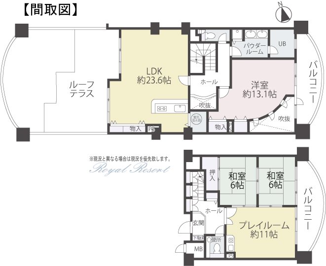 専有面積約151㎡のゆとりある空間に、約23.6帖のLDK、プレイルームや和室を備えた多彩な間取り。