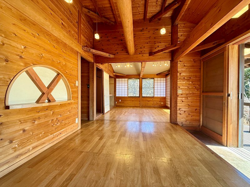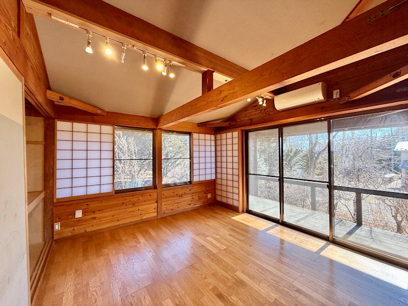 梁を現した空間と大きな開口部は、自然光がやさしく差し込み、リモートワークやアトリエ・工房使いがよく似合う雰囲気。二拠点生活をお考えの方にもおすすめです。見晴らしの良い2階の窓辺、縁側の様なウッドデッキはまるでカフェにいるような心地よさ。敷地内には立派なモミジや桜、白樺の木があり、四季を通して窓からの眺めを楽しむことができます。ぜひご見学にお出かけくださいませ。