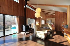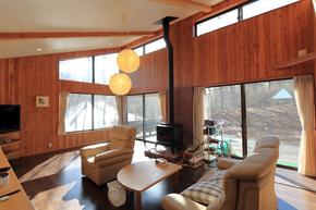 リビング中央に据えられた薪ストーブも、軽井沢には必需品と呼べる設備です。