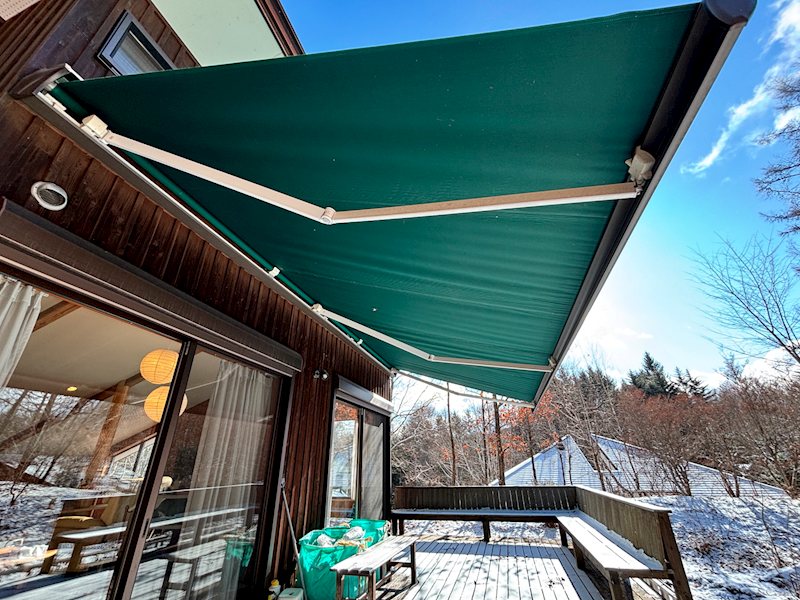 リビングからのウッドデッキには、大きな電動シェードが備わっております。