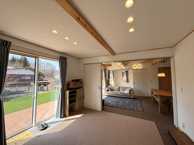 南向きで明るい室内。デッキからダイレクトに出ることができます。