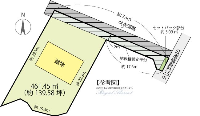 | 備考 | 現況:利用中 ■前面道路2項道路につき、測量の結果後退や造作物等の撤去を求められる可能性があります。また、記載のセットバック面積は参考面積の為、実際の面積と異なる場合があります。 ■本件敷地北東側の一部に、通行を目的として、北西側隣接地を要役地とする地役権が設定されています。(範囲:合計71.53㎡) ■共有通路部分に、上水道本管が敷設されており、当該本管より給水を受けています。 |