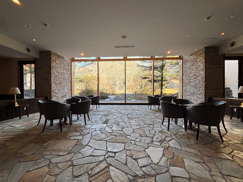 中庭を望む広々としたビューラウンジ。石張りテラス越しに緑をながめることができます