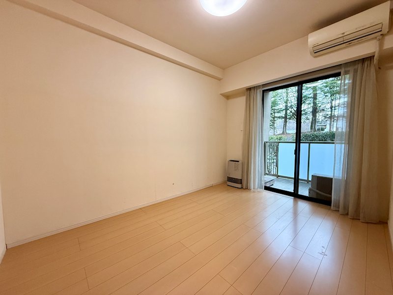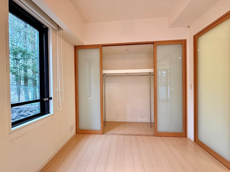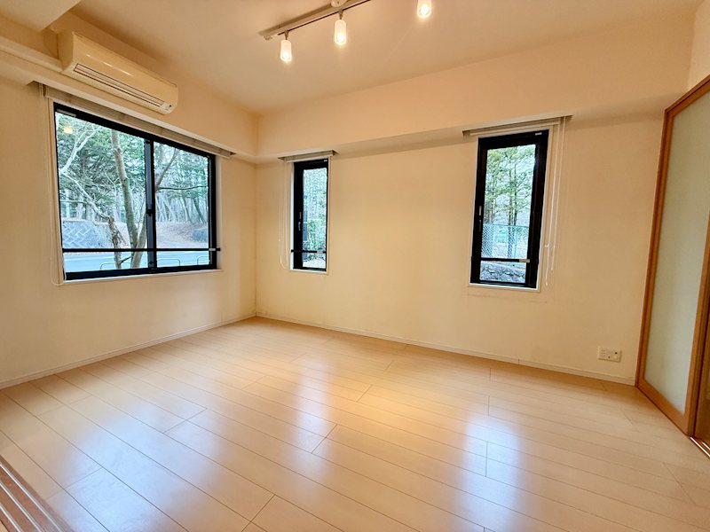 大きな窓から森を感じる8畳の寝室。在宅ワークや趣味の部屋にも最適です。