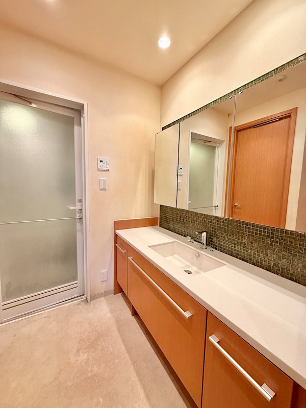 ホテルライクな広々洗面カウンター。3面鏡の裏側は収納になっています。