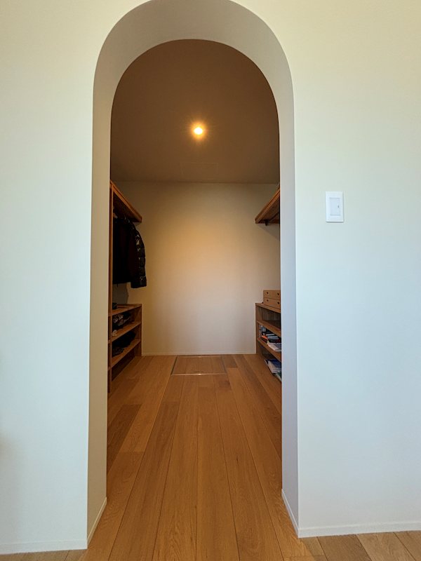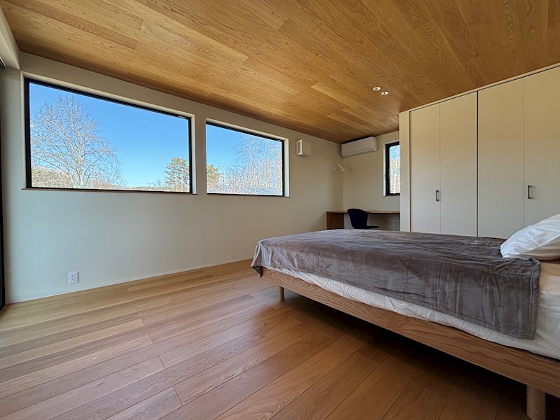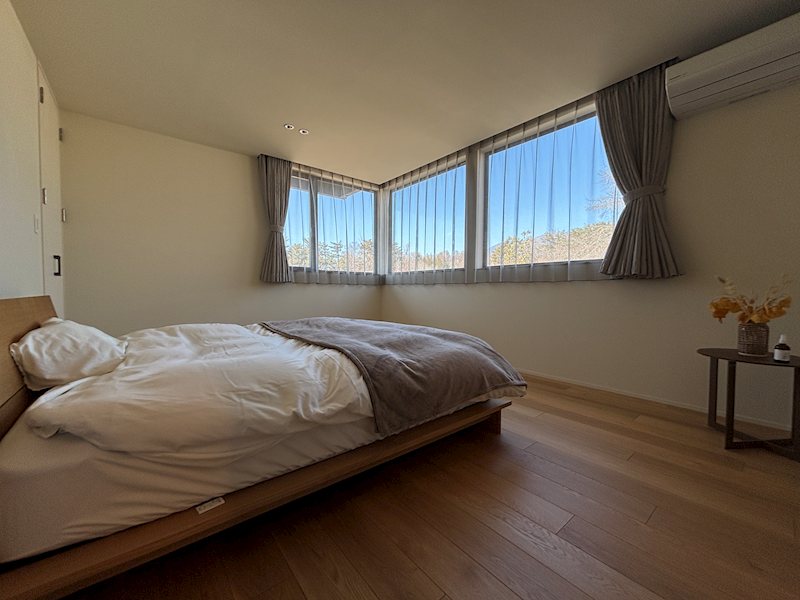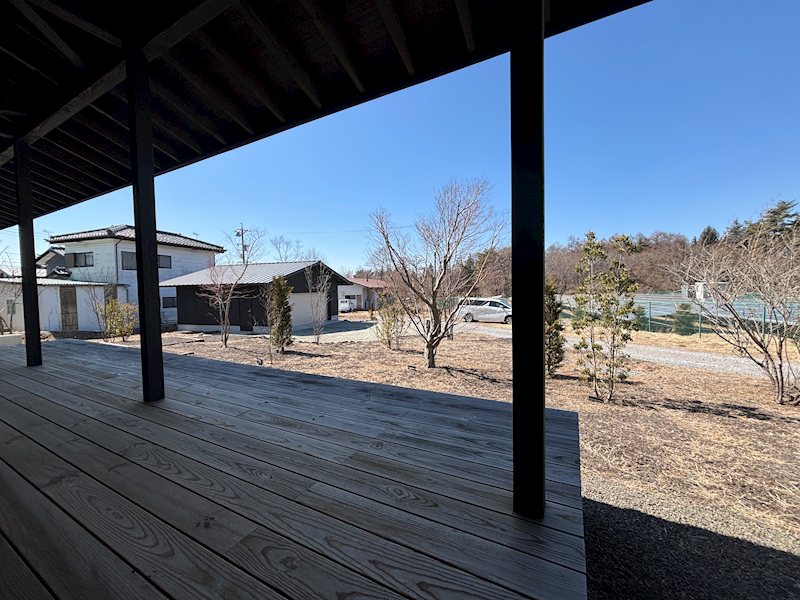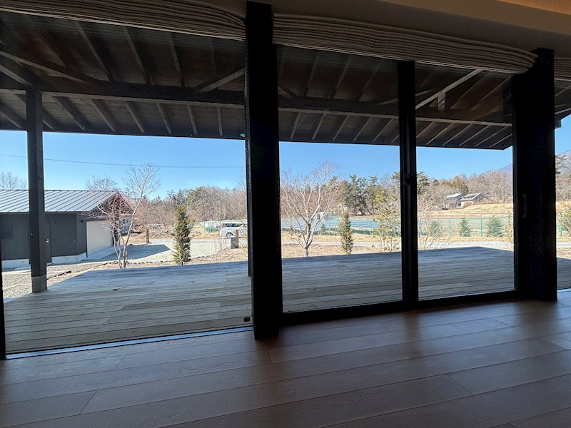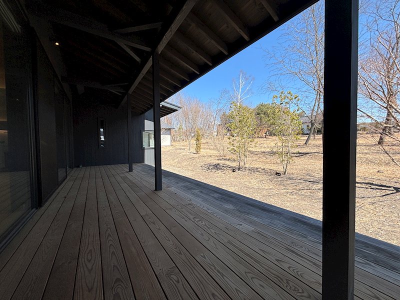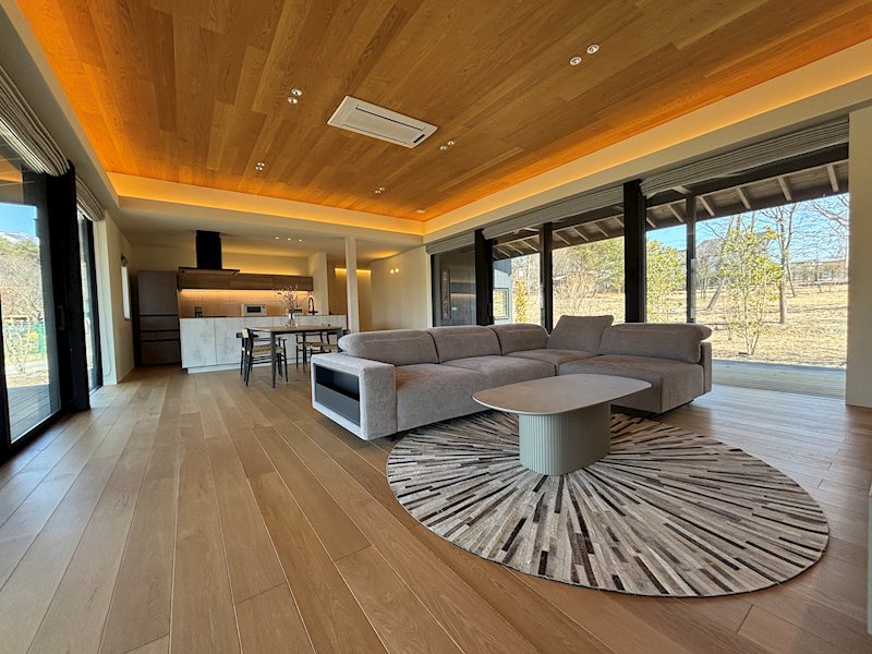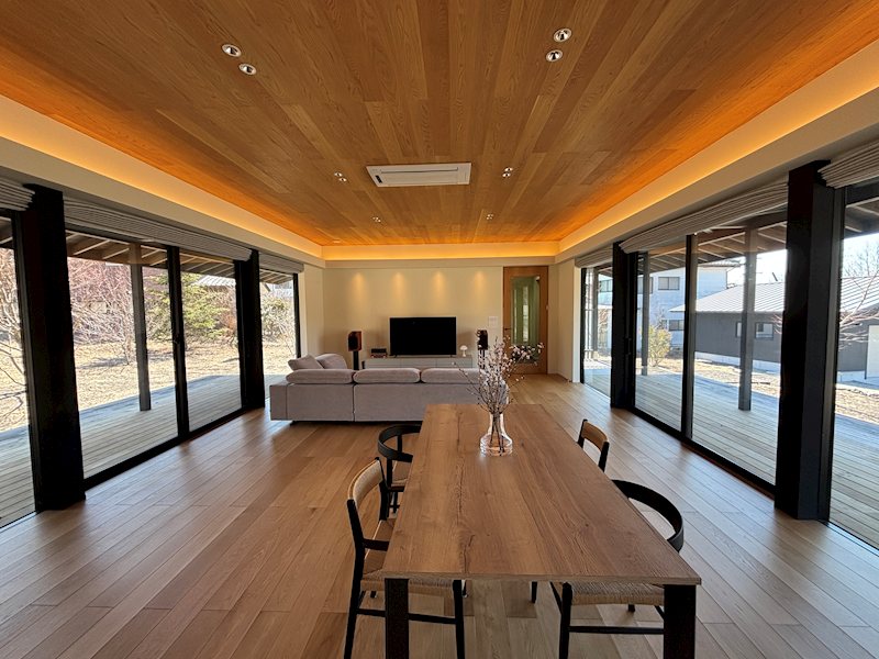私たちがこの家を建てる際に最も大切にしたのは、「自然と景色を楽しむこと」でした。浅間山の眺望や庭の美しさが主役になるような、控えめで上質な佇まいを目指しました。リビングは、東西両面に設けた6mの大開口から深い軒とウッドデッキで室内と庭をシームレスにつなげ、庭の中にリビングがあるような空間を目指しました。夜はグレアレスダウンライトと間接照明が癒しの空間を演出します。細部のディテールまで、職人さんの技と私たちの思いを込めて丁寧につくった家です。御代田の豊かな自然と、この静かで上質な時間を引き継いでくださる方にお譲りできれば嬉しく思っております。