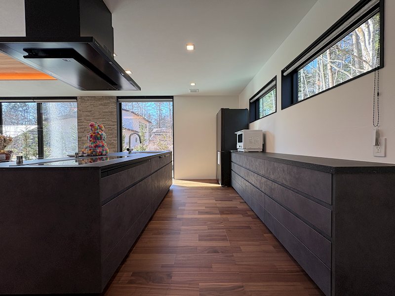 黒で落ち着いた雰囲気のキッチン。