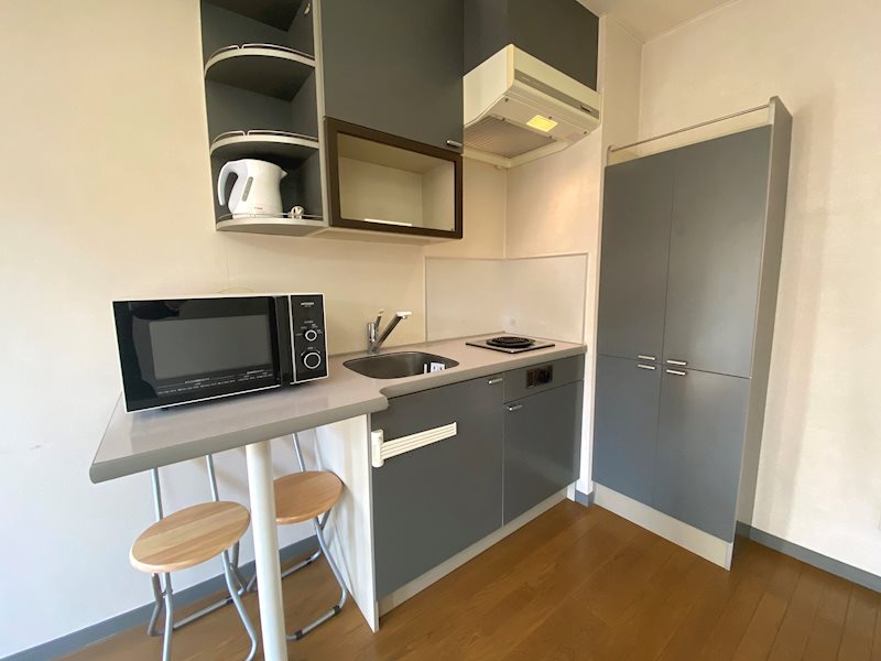 コンパクトながら必要十分なキッチン廻り。電子レンジもございます。