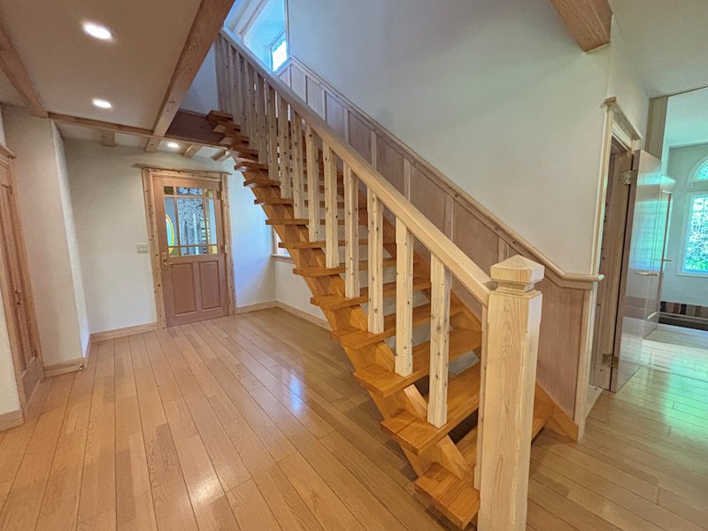 2階への階段は広めの設計で登りやすく、吹き抜け仕様で明るい印象です
