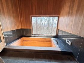 ヒノキのバスルームです。外の木々の緑を眺めながらお風呂に入るのも気持ちがいいですね。
