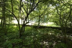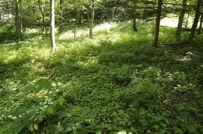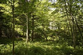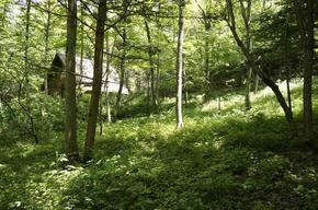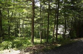 敷地内西側の様子。隣接地の別荘地レイクニュータウン側に建物が建っていますが、樹木でほとんど見えません