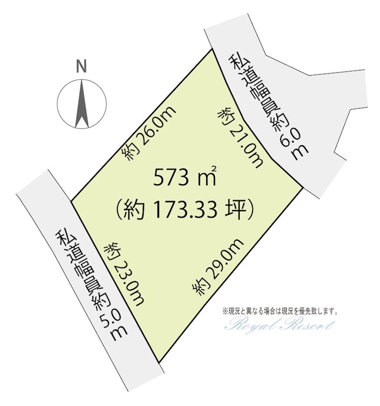 | 主な接道 | 私道、東、幅員:6m、接道長さ:21m、舗装あり